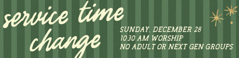 Join us for worship at our regular 10:30 a.m. service on Sunday, December 28. Please note there will be no Adult or Next Gen Groups meeting that morning. We look forward to worshiping with you!