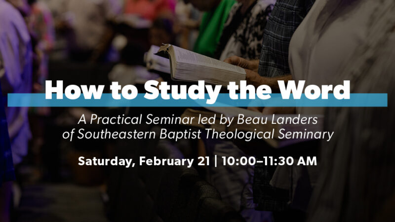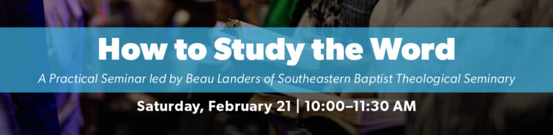 Join us on Saturday, February 21, from 10:00–11:30 a.m. at the Brentwood Campus Welcome Center for a practical seminar led by Beau Landers of Southeastern Baptist Theological Seminary. You’ll gain helpful tools for studying Scripture—learning key contexts, essential questions to ask of the text, and effective ways to read Paul’s letters and other New Testament epistles.